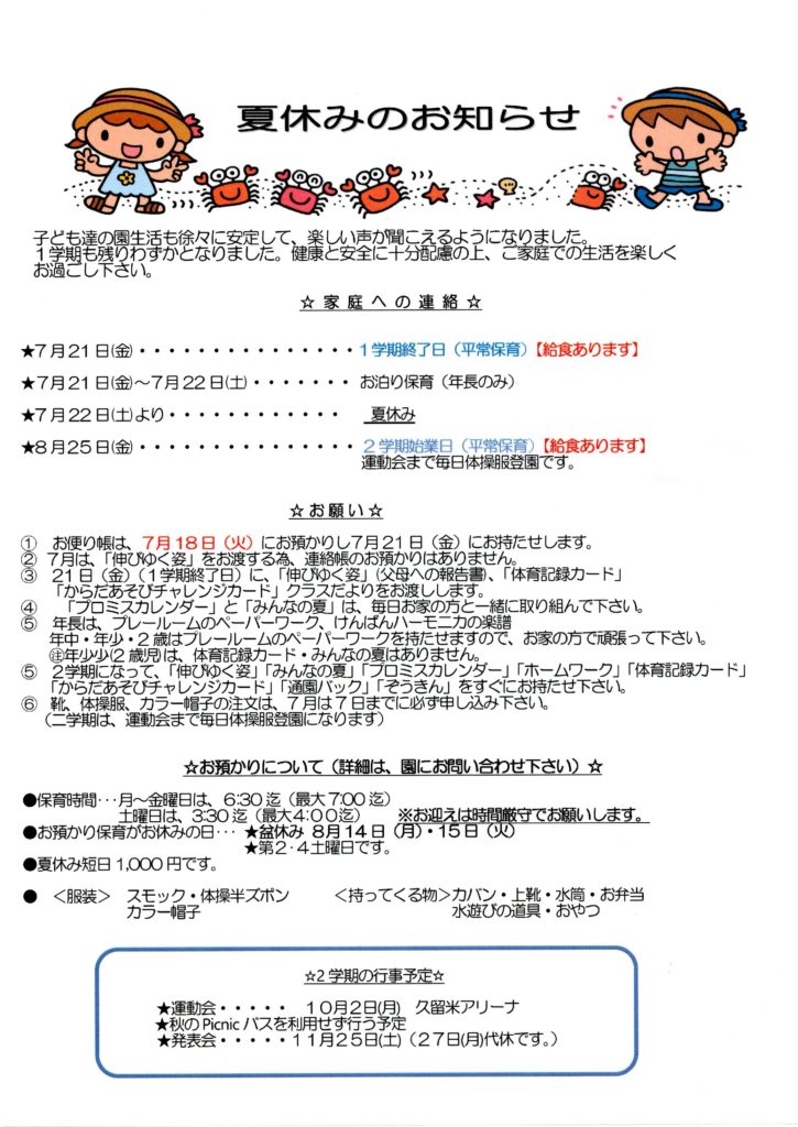夏休みのお知らせ