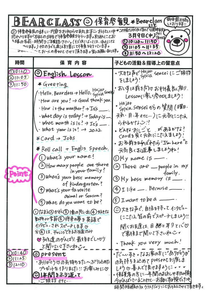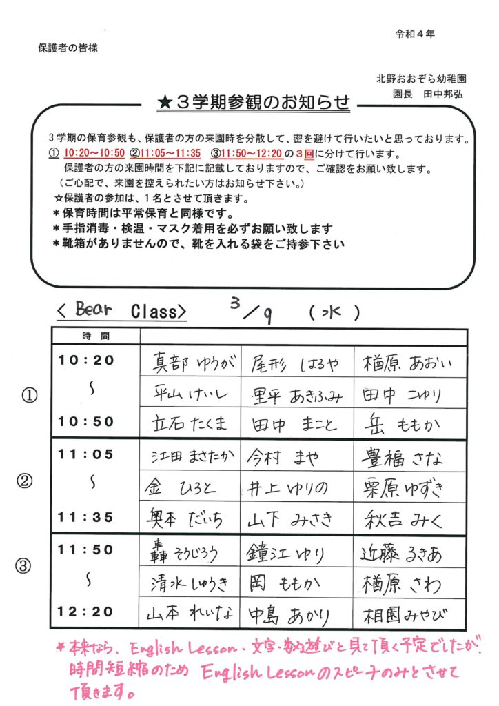 3学期参観のお知らせと保育参観の流れ