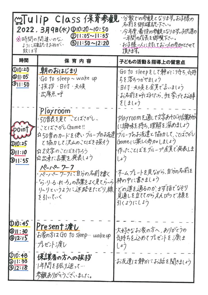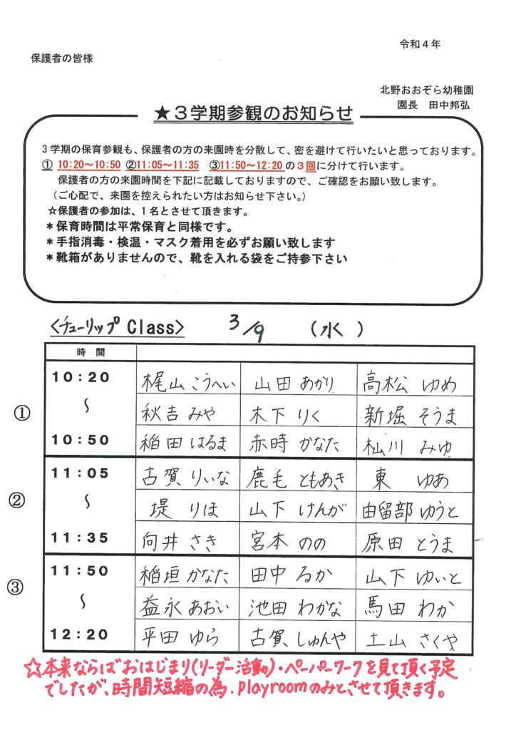 3学期参観のお知らせと保育参観の流れ