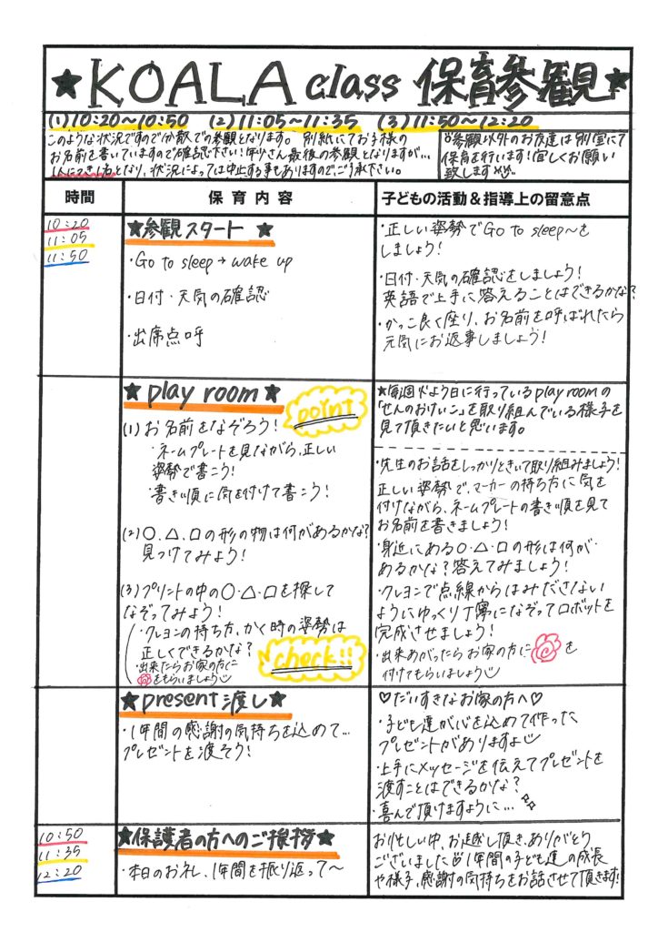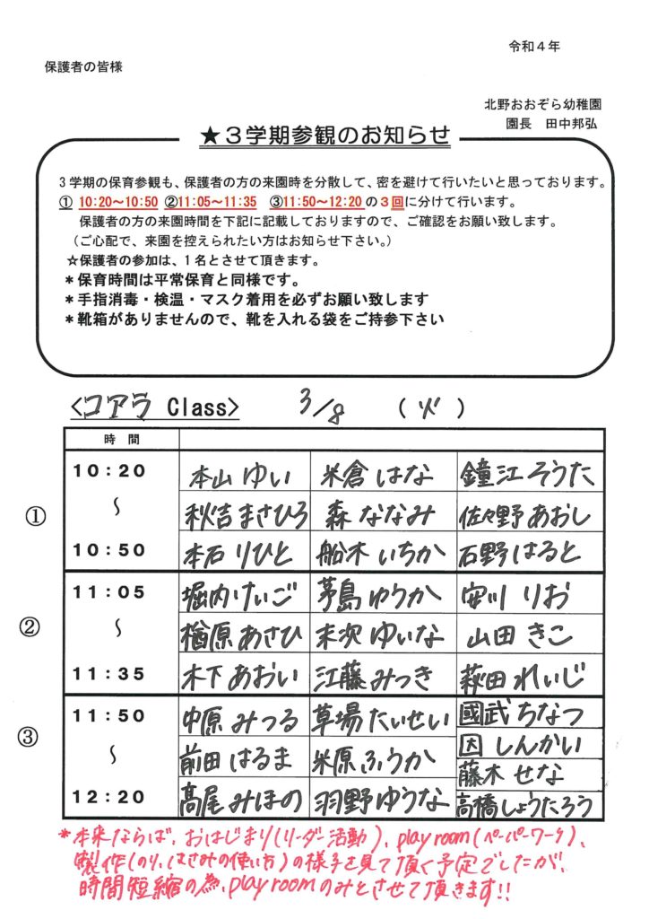 3学期参観のお知らせと保育参観の流れ