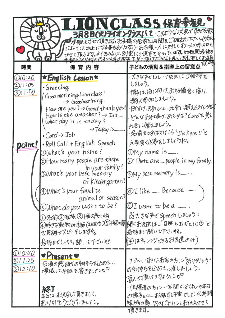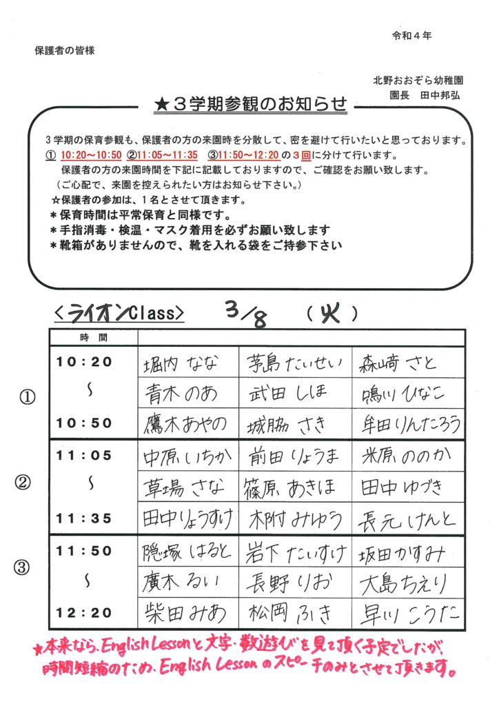 3学期参観のお知らせと保育参観の流れ