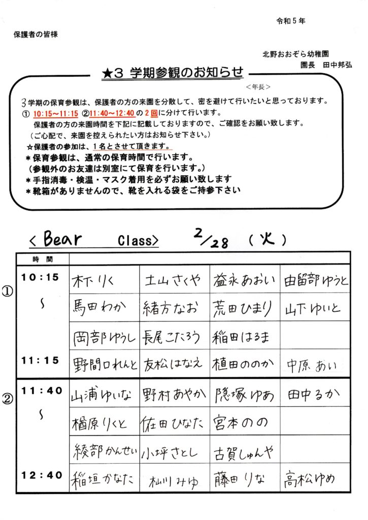 3学期参観のお知らせ