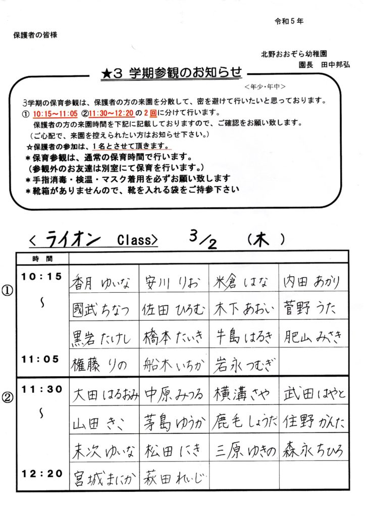 3学期参観のお知らせ