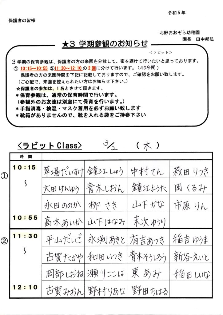 3学期参観のお知らせ