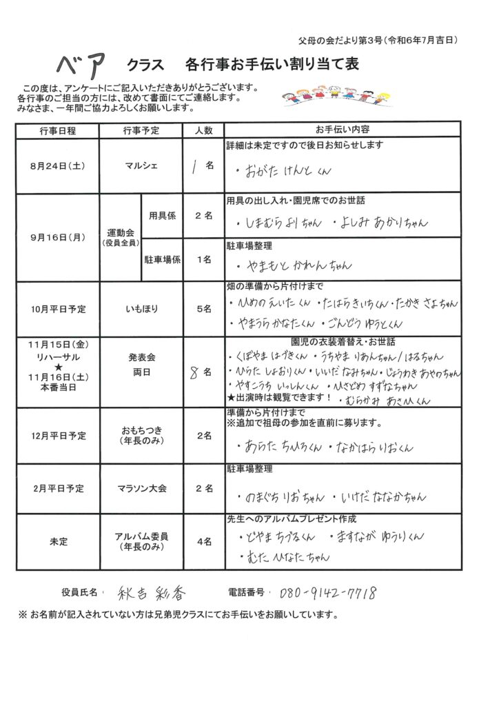 父母の会年間行事のお手伝い割当て表
